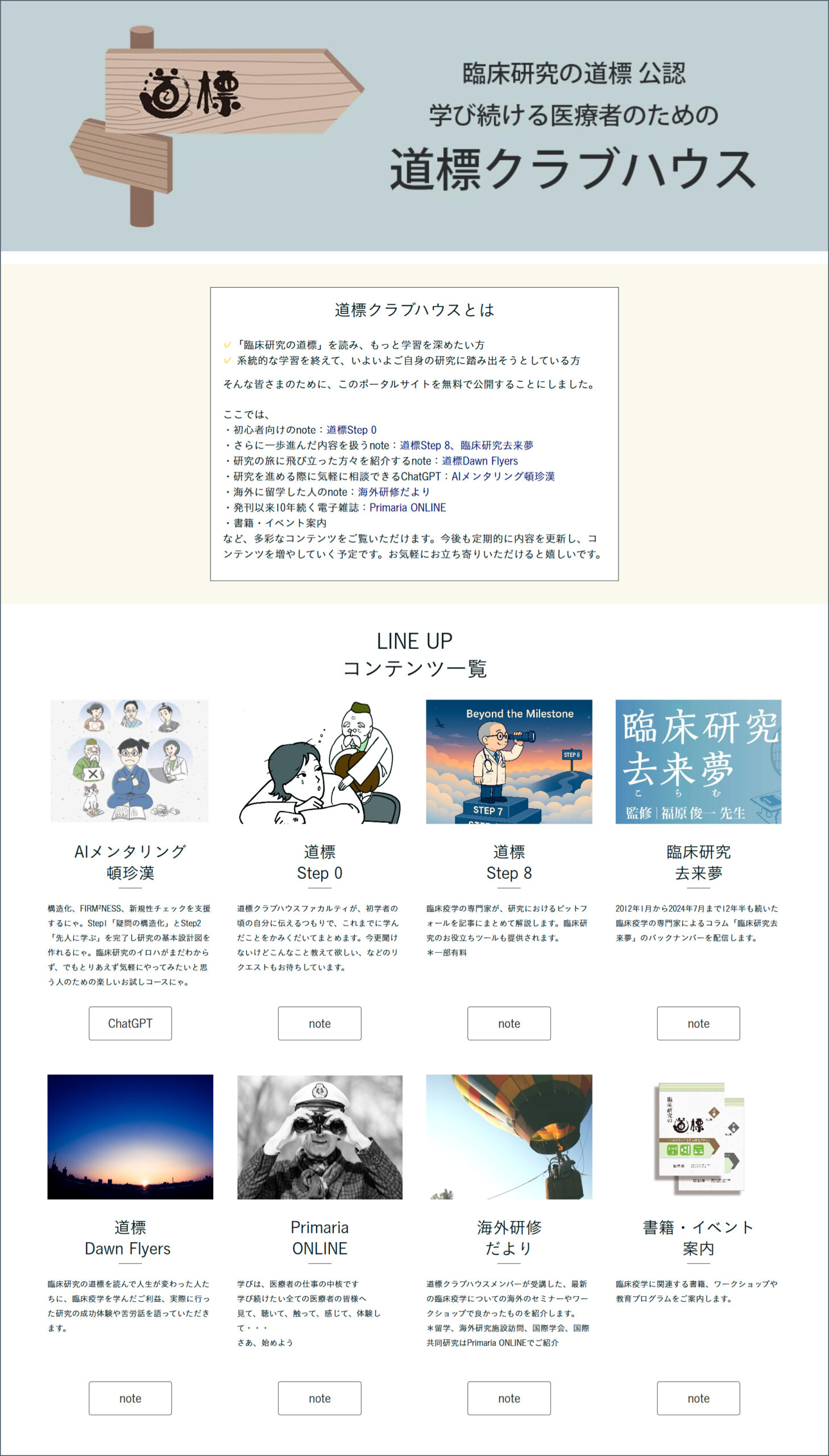 このたび、書籍 『臨床研究の道標』 の読者に向け、臨床研究の学習を応援するポータルサイト「道標クラブハウス」 をオープンしました。 臨床研究に関心をお持ちの方がいらっしゃいましたら、ぜひお知らせくださ